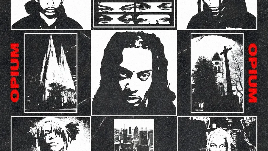 Collage En Blanco Y Negro Que Presenta Retratos E Imágenes Urbanas Con La Palabra Opium En Rojo A Ambos Lados, Representando Un Tema De Álbum Musical.