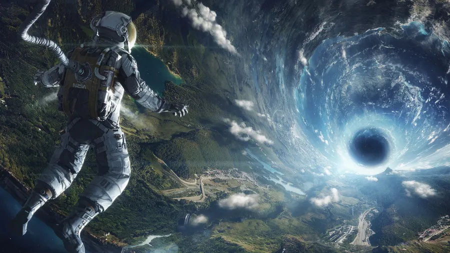 Un Astronauta Flota Cerca De Un Vórtice Espacial Giratorio Sobre Un Planeta, Destacando La Naturaleza Misteriosa Y Vasta De La Exploración Del Espacio Exterior.