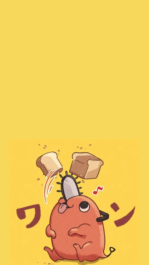 El Personaje Animado Pochita De Chainsaw Man Baila Alegremente Con Notas Musicales Y Trozos De Pan Volando Alrededor, En Un Fondo Amarillo.