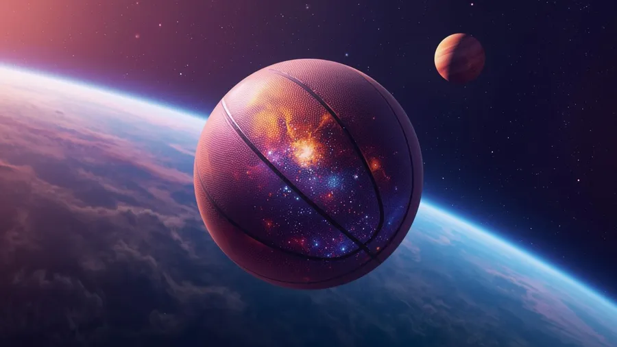 Un Baloncesto Cósmico Flota Sobre La Tierra Con Una Pelota Más Pequeña Cerca, Fusionando Temas Deportivos Y Del Espacio Exterior En Una Impresionante Visual.