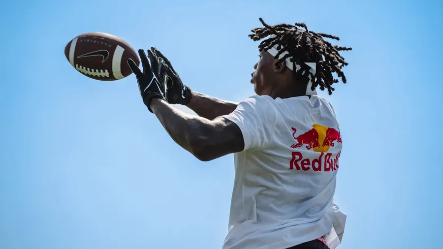 Jeremiah Smith Practica Atrapar Balones De Fútbol Durante Una Sesión De Entrenamiento Al Aire Libre Bajo Un Cielo Azul Claro.