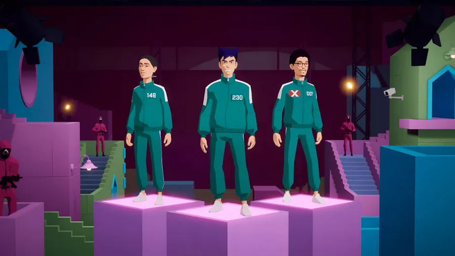 Personajes Animados En Trajes Verdes Enfrentándose A Un Colorido Y Surrealista Entorno De Juego Inspirado En Squid Game Con Un Giro De Thanos.