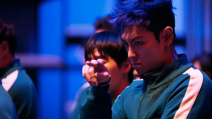 Momento Intenso De Squid Game Mostrando A Un Concursante Enfocado Apuntando Con Un Arma, Capturando La Tensión De Alto Riesgo Y El Tema De Supervivencia Reminiscentes De Los Desafíos Al Estilo De Thanos.