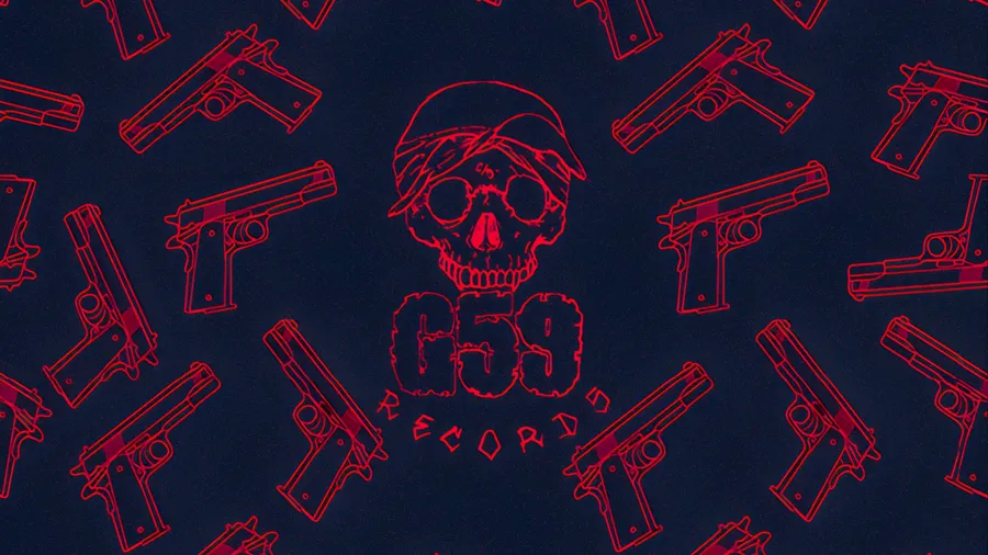 Gráfico De Temática Oscura Que Presenta Un Cráneo Con Un Pañuelo Y Múltiples Armas Rojas, Representando La Identidad De Marca De G59 Records.
