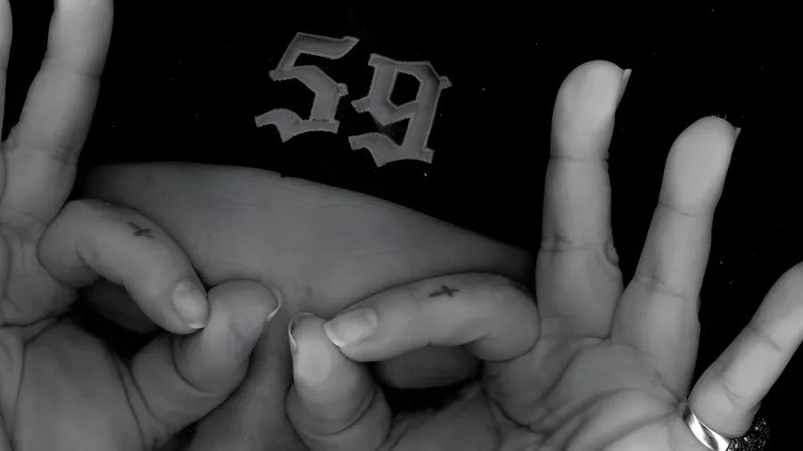 Un Primer Plano De Manos Formando Un Distintivo Signo De La Pandilla G59 Con Un Fondo Negro Y El Número 59 Visible En La Ropa.
