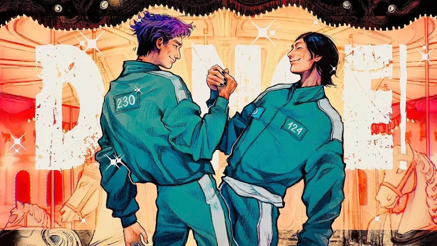 Dos Jugadores En Trajes Verdes Se Enfrentan En Un Momento Tenso Durante La Competencia Del Juego Del Calamar Con Un Fondo Dramático.
