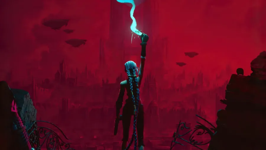 Momento Intenso De Arcane Temporada 2 Con Un Personaje Empuñando Poderosos Rayos En Un Entorno Oscuro Y Dramático Con Un Fondo De Cielo Rojo.