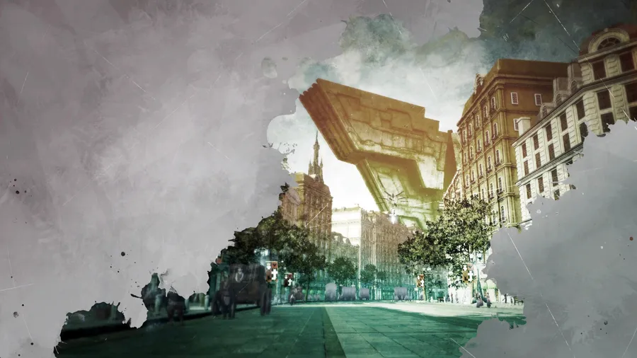 Paisaje Urbano Surrealista Que Combina Arquitectura Clásica Con Formas Geométricas Abstractas, Evocando Una Narrativa Metafórica Onírica En Un Entorno Urbano Imaginativo.