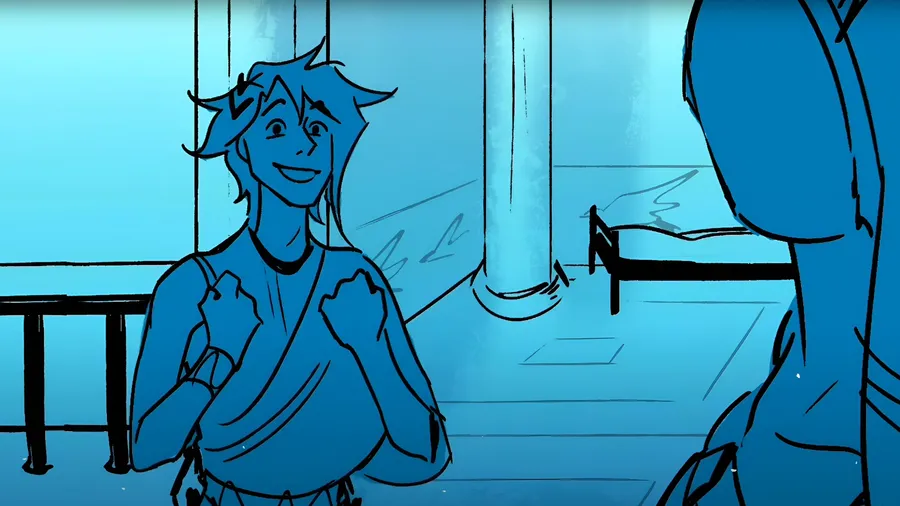 Escena Animada De Epic The Musical Mostrando Un Personaje En Un Entorno De Tonos Azules Con Gestos Expresivos Y Elementos De Fondo Detallados.