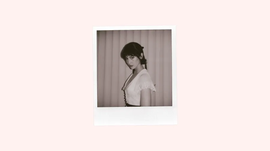Una Foto Polaroid De Inspiración Vintage De Gracie Abrams Con Un Suave Fondo Rosa, Destacando Su Estética Casual E Íntima.