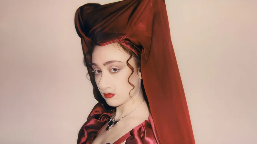 Chappell Roan Muestra Su Distintiva Moda Con Un Dramático Atuendo Rojo Y Tocado, Destacando Su Audaz Personalidad Artística.