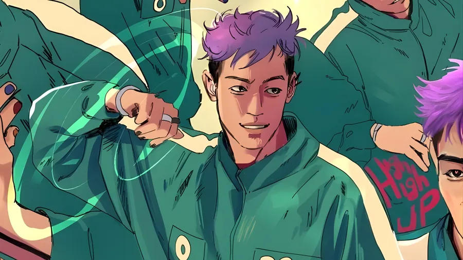 Arte Creativo Que Mezcla El Estilo Del Personaje Thanos Con El Tema De Squid Game, Presentando Expresiones Intensas Y Poses Dinámicas En Trajes Deportivos Verdes.