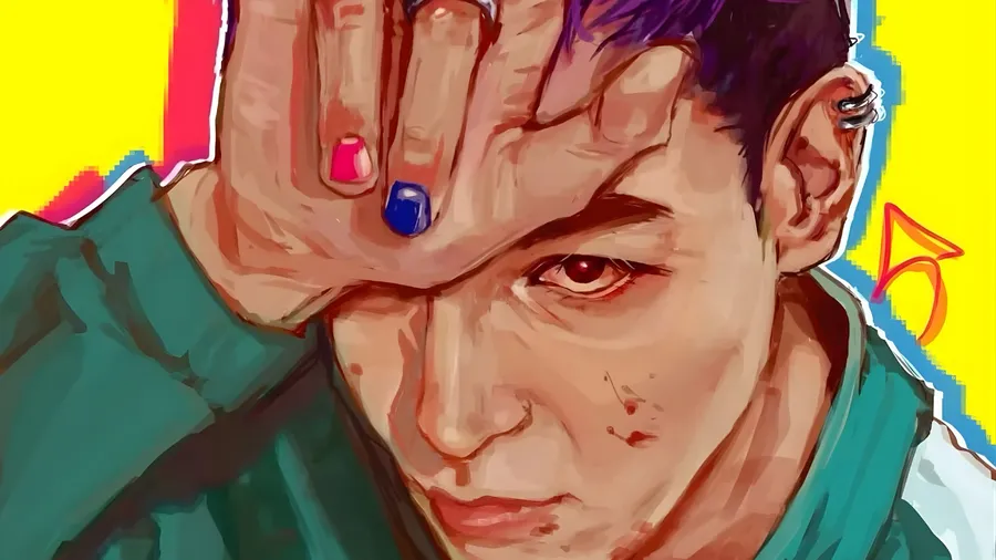 Obra De Arte Digital Que Mezcla Temas De Thanos Y Squid Game, Presentando Expresiones Intensas De Los Personajes Y Colores Vibrantes.