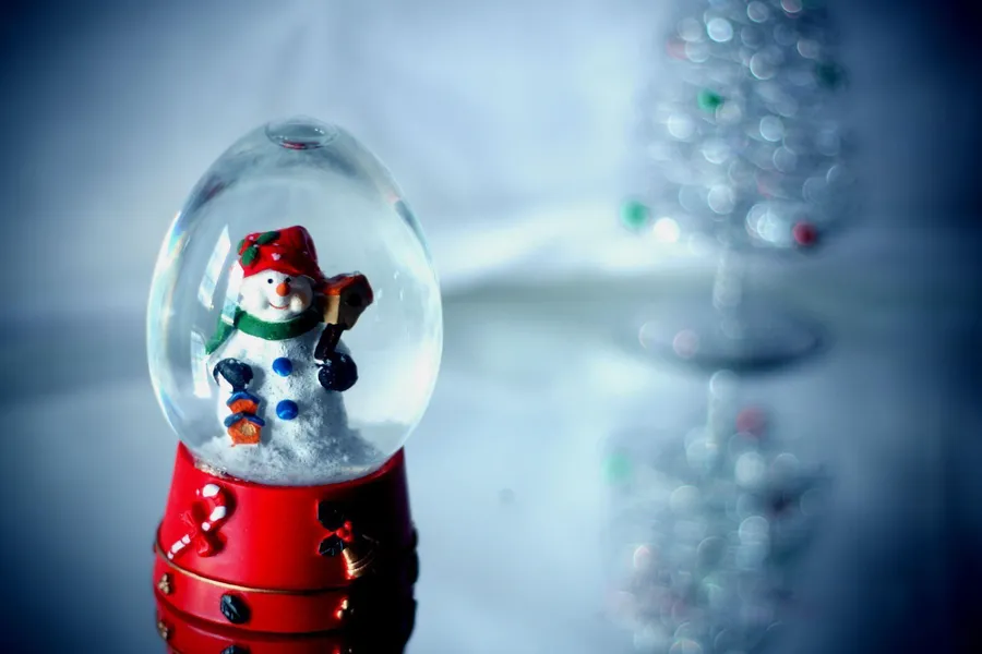 Primer Plano De Un Globo De Nieve Festivo Que Presenta Un Muñeco De Nieve En Su Interior Con Un Árbol De Navidad Desenfocado En El Fondo, Creando Una Atmósfera De Vacaciones Invernales.
