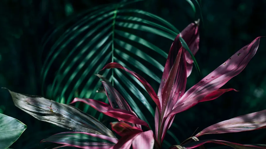 Hojas Rosadas Vibrantes Contrastan Con El Follaje Verde Profundo Creando Una Atmósfera Tropical Exuberante Perfecta Para Diseños Inspirados En La Naturaleza Y Ideas De Decoración.