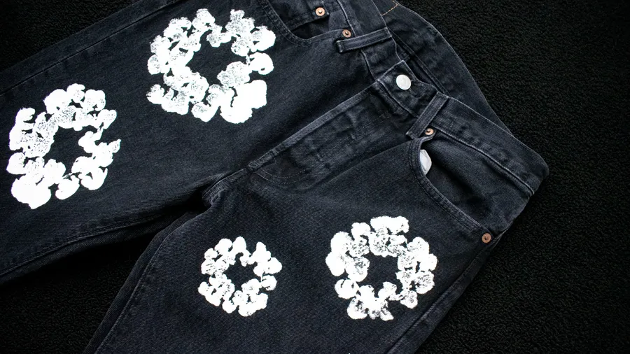 Jeans De Mezclilla Negra Con Distintivos Parches Florales Blancos, Mostrando La Mezcla Única De Denim Tears De Streetwear Y Narración Cultural.