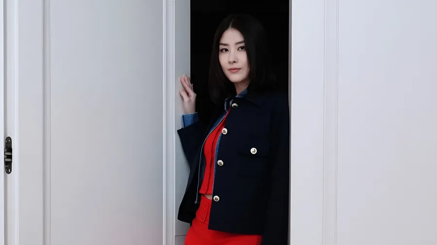 Kelly Chen Posa Con Confianza En Un Elegante Vestido Rojo Combinado Con Una Chaqueta Azul Marino, Mostrando Su Estilo Elegante Y De Moda.