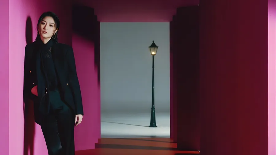 Kelly Chen Posa Con Confianza En Un Elegante Traje Negro Contra Un Vibrante Fondo Rosa Y Gris Con Una Farola A Lo Lejos.