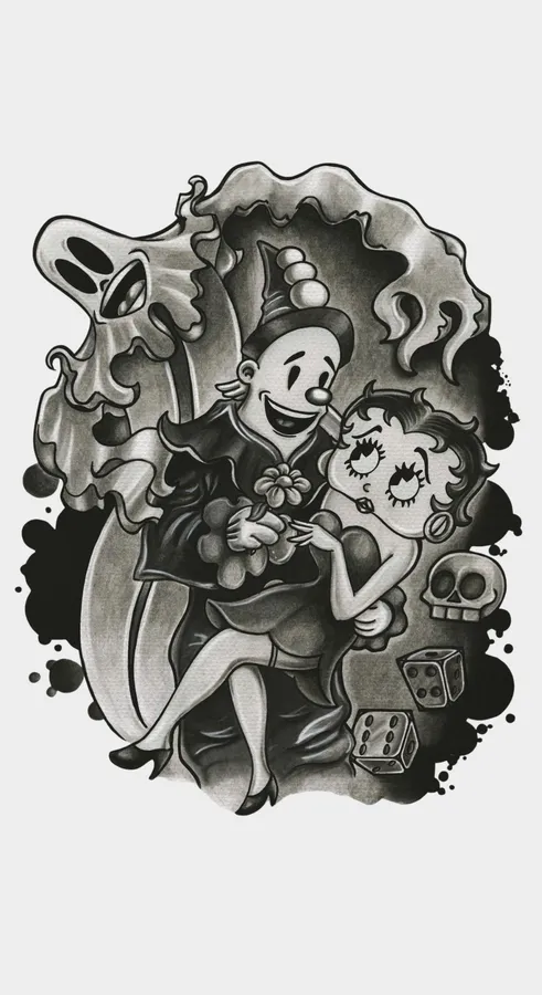 Ilustración En Blanco Y Negro De Estilo Vintage Que Presenta A Koko El Payaso Con Betty Boop Rodeados De Elementos Espeluznantes Y Dados Para Un Ambiente Nostálgico De Dibujos Animados.