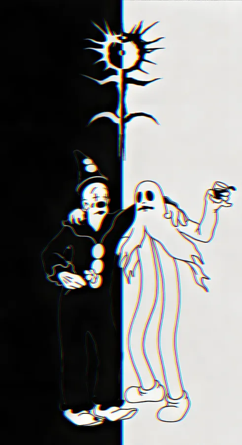 Ilustración Clásica En Blanco Y Negro Que Presenta A Koko El Payaso Con Una Figura Fantasmal Y Una Flor Surrealista Que Simboliza El Estilo De Animación Temprana.