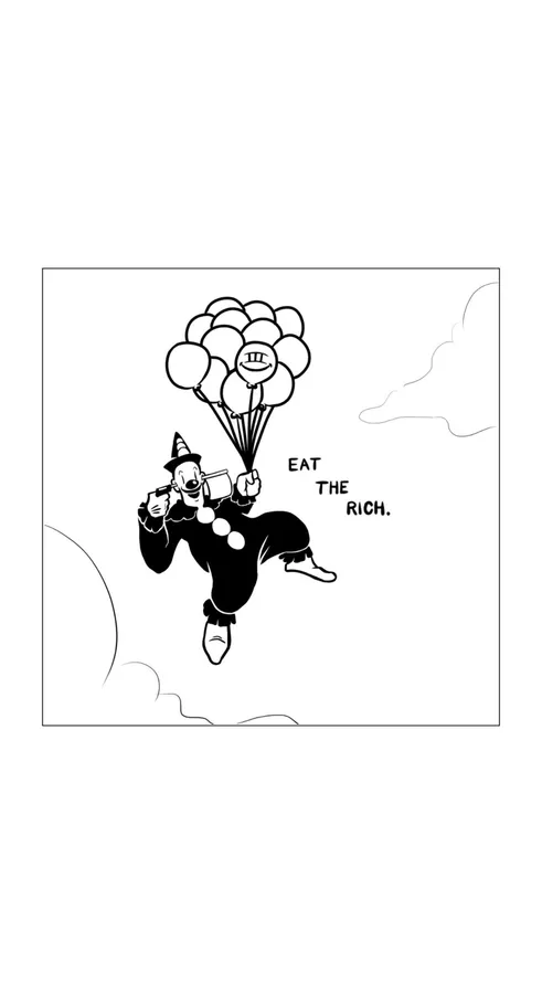Koko El Payaso Flota Con Globos Sosteniendo Un Cartel Que Dice Come A Los Ricos En Un Estilo Clásico De Dibujo Animado En Blanco Y Negro