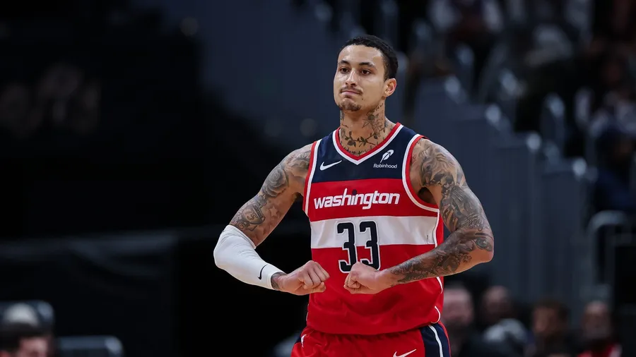 Kyle Kuzma Vistiendo La Camiseta De Los Washington Wizards Durante Un Partido De Baloncesto, Mostrando Enfoque Y Determinación.