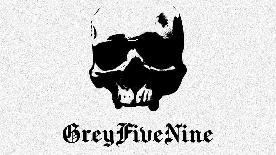 Diseño Icónico De Calavera Greyfivenine Que Representa La Marca G59 Con Tipografía Gótica Audaz Y Atractivo Estético Oscuro.