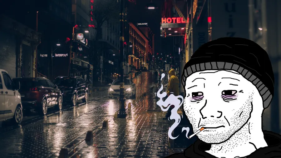 Un Personaje De Dibujos Animados Melancólico Fuma En Una Calle De La Ciudad Lluviosa Por La Noche, Capturando Sentimientos De Soledad E Introspección En La Soledad Urbana.