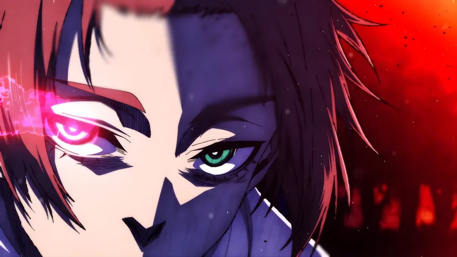 Primer Plano De Sae Itoshi Con Un Ojo Brillante Y Una Iluminación Roja Dramática Que Resalta Su Expresión Intensa Y Rasgos Afilados.