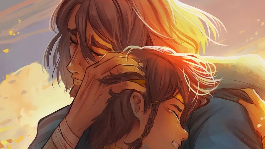 Una Escena Conmovedora De Epic The Musical Que Muestra A Dos Personajes Compartiendo Un Cálido Y Emocional Abrazo Bañado En Luz Dorada.
