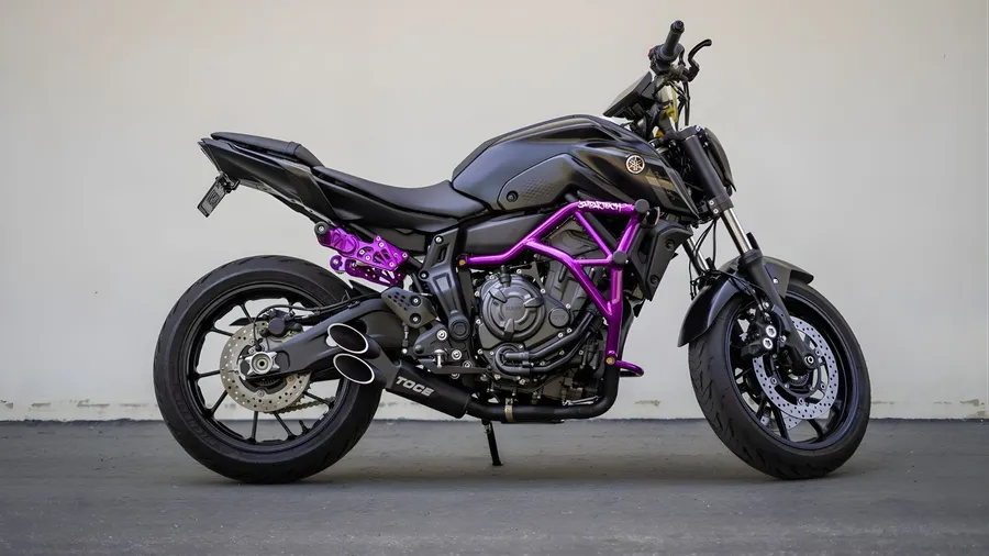 Sleek Yamaha Mt 07 Motocicleta Con Un Cuerpo Negro Y Acentos De Marco Morado, Diseñada Para Rendimiento Y Estilo En La Carretera.