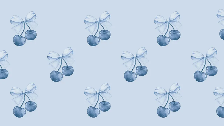 Patrón Sin Costuras Que Presenta Cerezas Azules Atadas Con Delicados Lazos Azules Sobre Un Suave Fondo Azul, Perfecto Para Diseños De Tela O Papel Tapiz.
