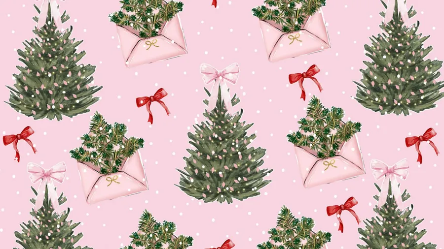 Lazos Festivos De Navidad Y Árboles Decorados Sobre Un Suave Fondo Rosa Crean Un Encantador Patrón Navideño Perfecto Para Papel De Regalo O Diseños De Temporada.
