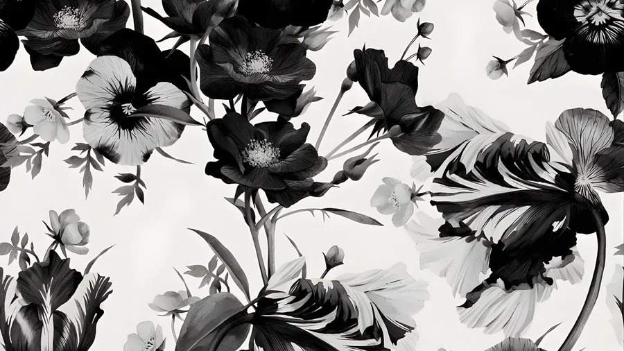 Diseño Floral Monocromático Elegante Que Presenta Flores Y Hojas Detalladas En Blanco Y Negro Para Un Atractivo Decorativo Atemporal.
