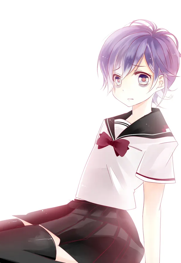 Personaje De Anime Ilustrado Con Cabello Púrpura, Ojos Rojos, Vistiendo Un Uniforme Blanco Y Negro Con Una Corbata Roja.