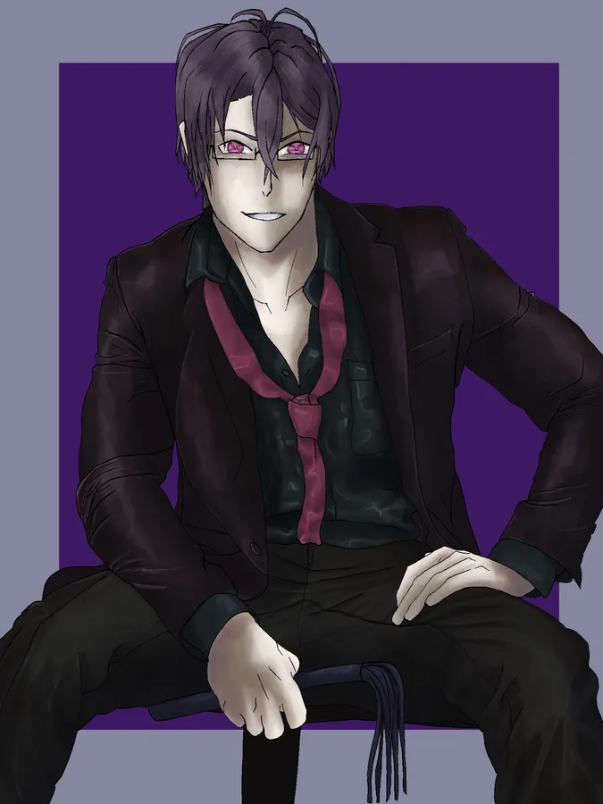 Retrato Ilustrado De Reiji Sakamaki, Un Personaje Masculino De Anime Con Ojos Morados, Sentado Con Confianza Contra Un Fondo Púrpura, Vistiendo Un Traje Oscuro Con Una Camisa Verde Y Corbata Roja.