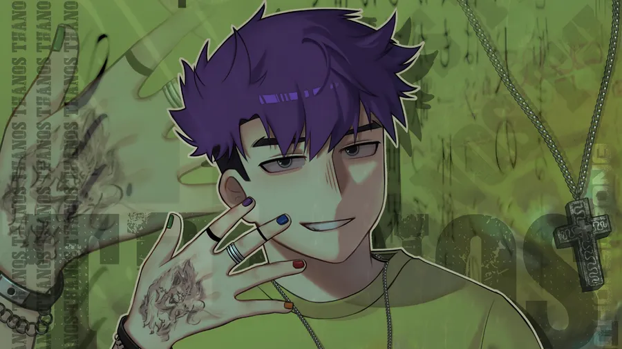 Personaje De Estilo Anime Oscuro Inspirado En Thanos Y Squid Game Con Cabello Púrpura Y Expresión Misteriosa.