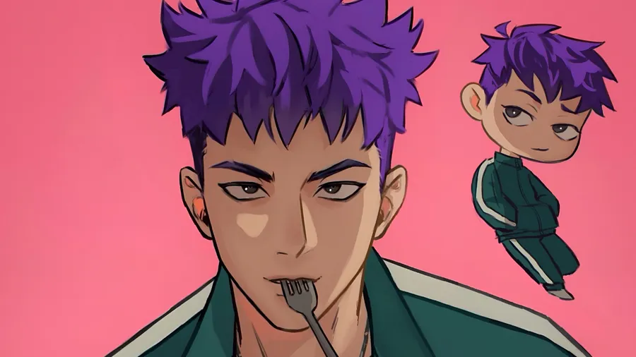 Explora El Diseño Único De Personaje Inspirado En Thanos Que Combina El Estilo De Squid Game Con Cabello Púrpura Audaz Y Una Expresión Intensa, Capturando Una Apariencia Feroz Y Memorable.