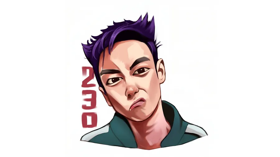 Ilustración De Un Concursante De Squid Game Con Un Peinado Único Y Expresión Intensa, Con El Número 230 En El Lado.