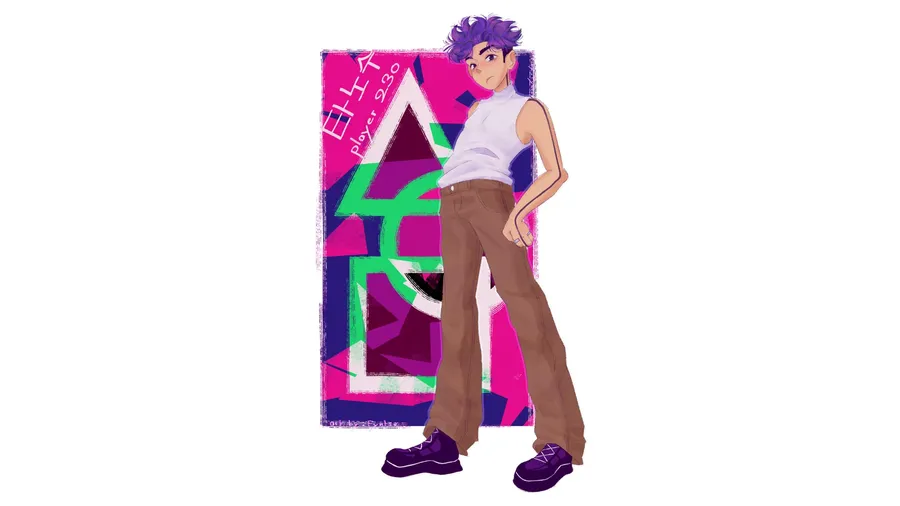Ilustración Estilizada De Un Personaje Seguro Inspirado En Squid Game Con Un Vibrante Fondo Geométrico Y Atuendo Moderno Casual.
