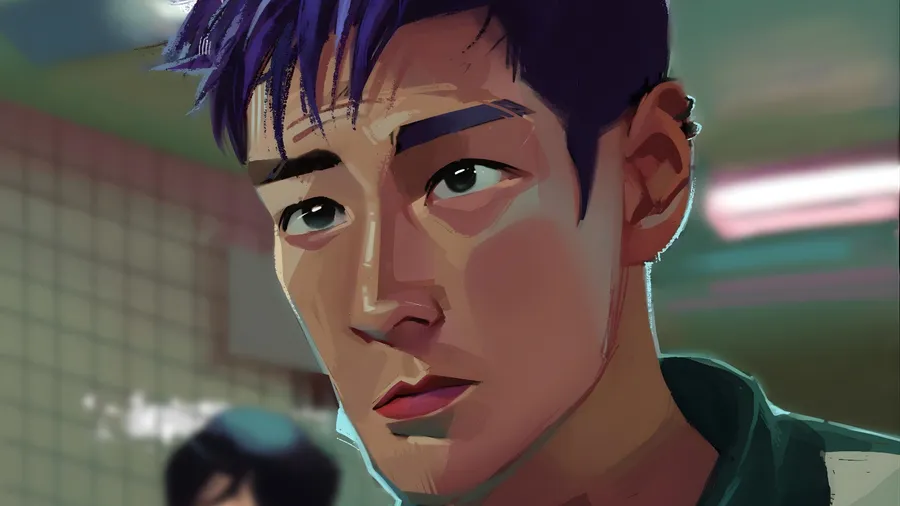 Un Retrato Digital Detallado De Un Joven De Thanos Squid Game, Mostrando Emociones Intensas Y Colores Vibrantes En Un Entorno Dramático.