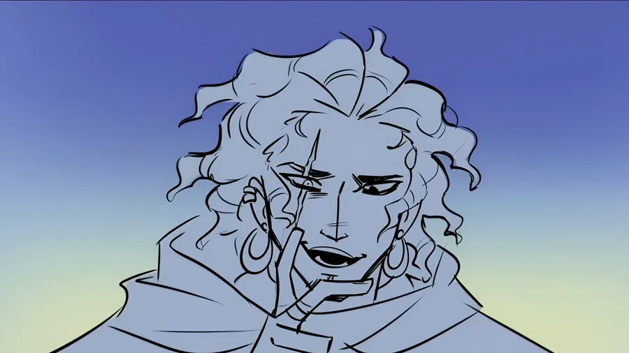 Personaje Animado De Epic The Musical Con Una Expresión Intensa Y Cabello Fluido Contra Un Fondo De Cielo Degradado.
