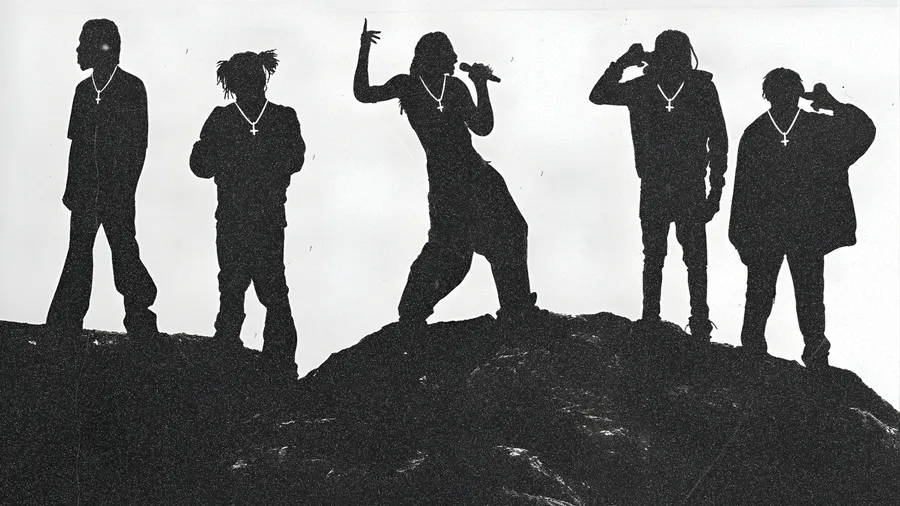 Silhouette Icónica De Los Miembros De La Banda Opium Actuando En El Escenario, Capturando Su Energía Dinámica Y Estilo Único En Una Impactante Imagen En Blanco Y Negro.
