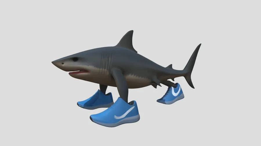 Una Ilustración 3d Juguetona De Un Tiburón Luciendo Zapatillas Nike Azules Brillantes En Aletas Contra Un Fondo Simple.